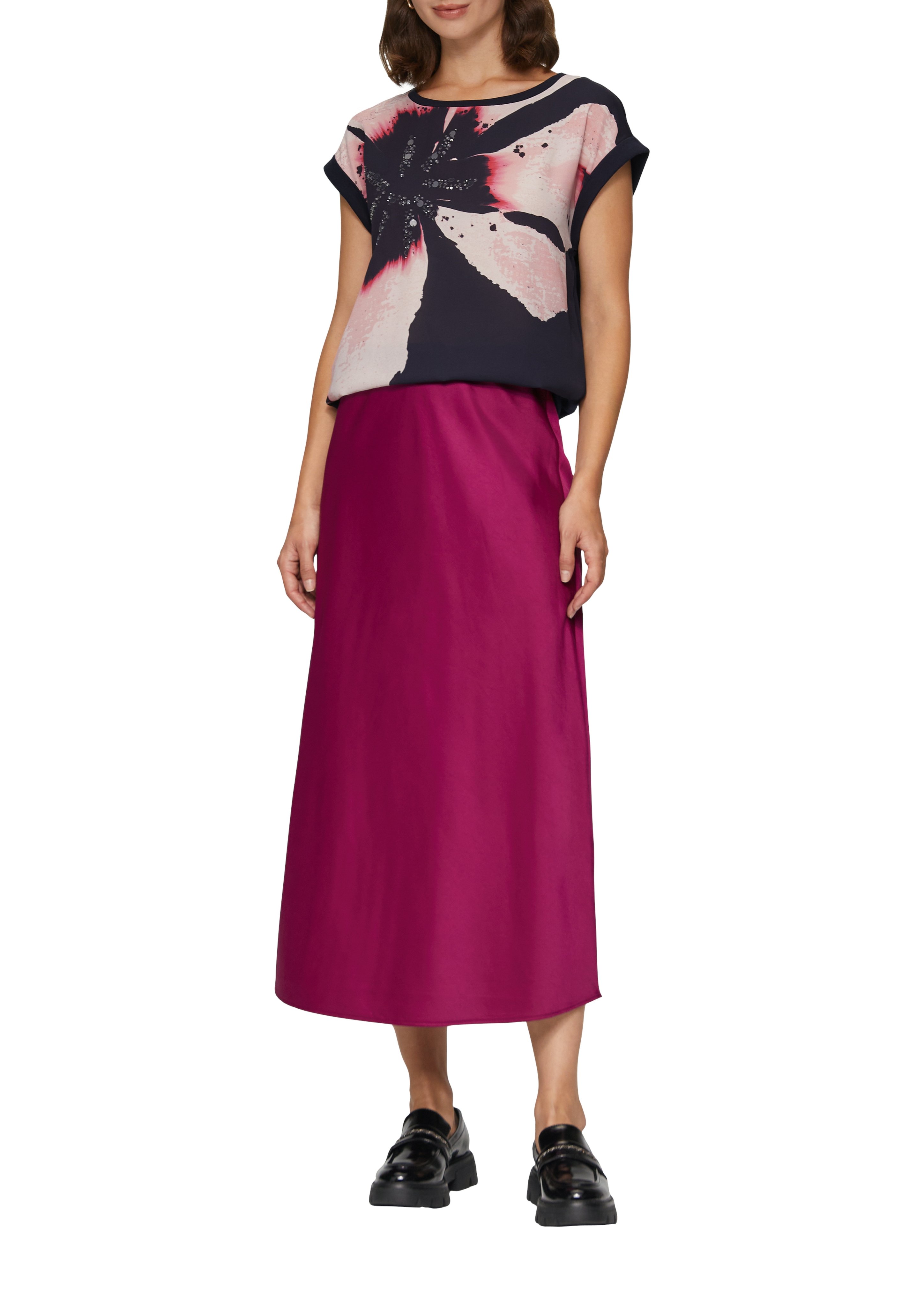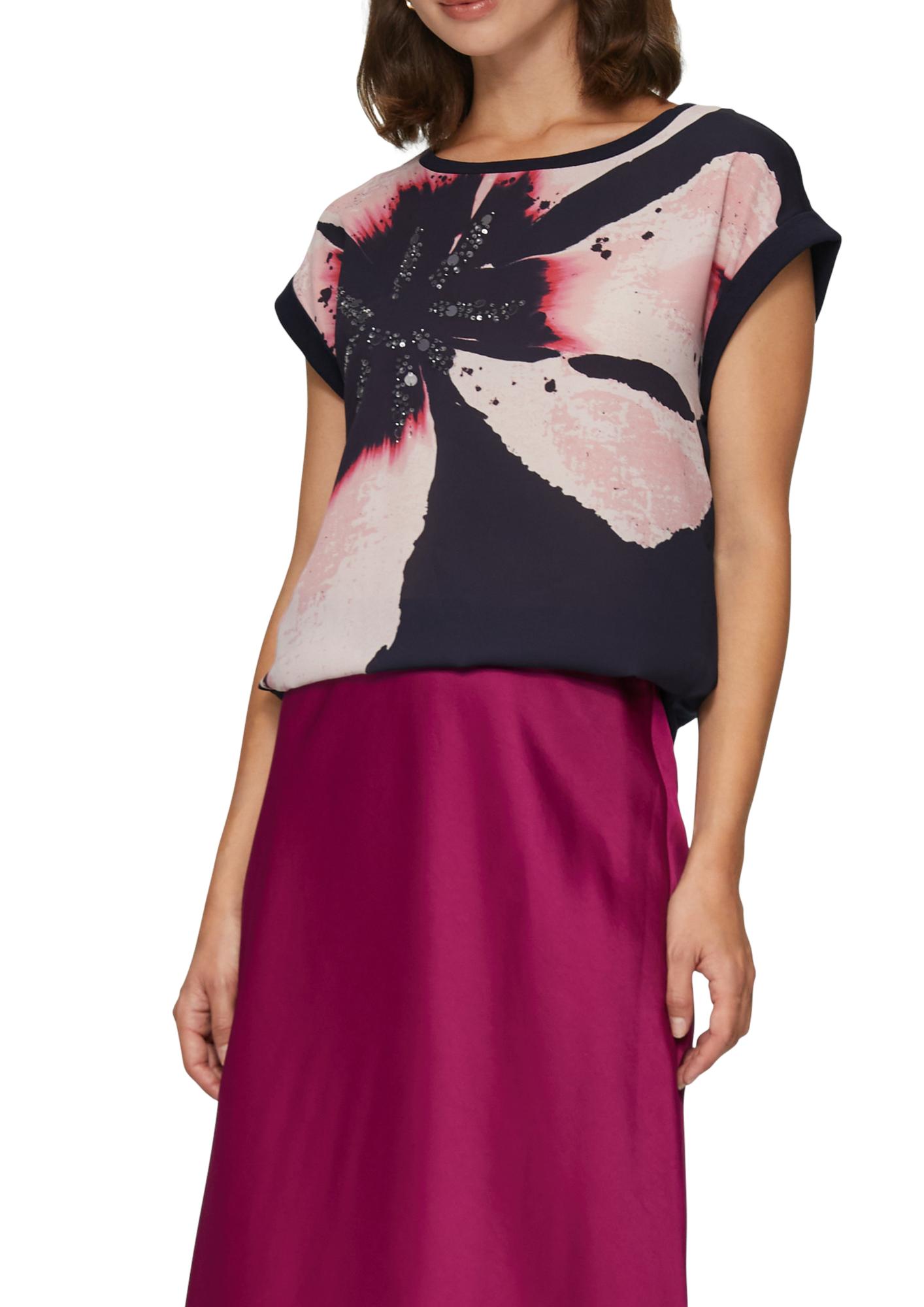 Блуза - футболка с коротким рукавом с акцентным цветком немецкого бренда S.Oliver (С.Оливер). Цветочный принт хорошо дополняет весенние образы. Он может присутствовать не только на платьях, но так же на блузках и рубашках. При этом дизайнеры предлагают носить как мелкий цветок, так и крупные аппликации. Если вы хотите создать романтичный образ, обратите внимание на модные модели блузок, где цветы присутствуют в виде акцентов. Они могут быть нанесены на рукава, плечи, карманы. Хорошо смотрятся крупные узоры, в которых сочетается несколько нежных оттенков.