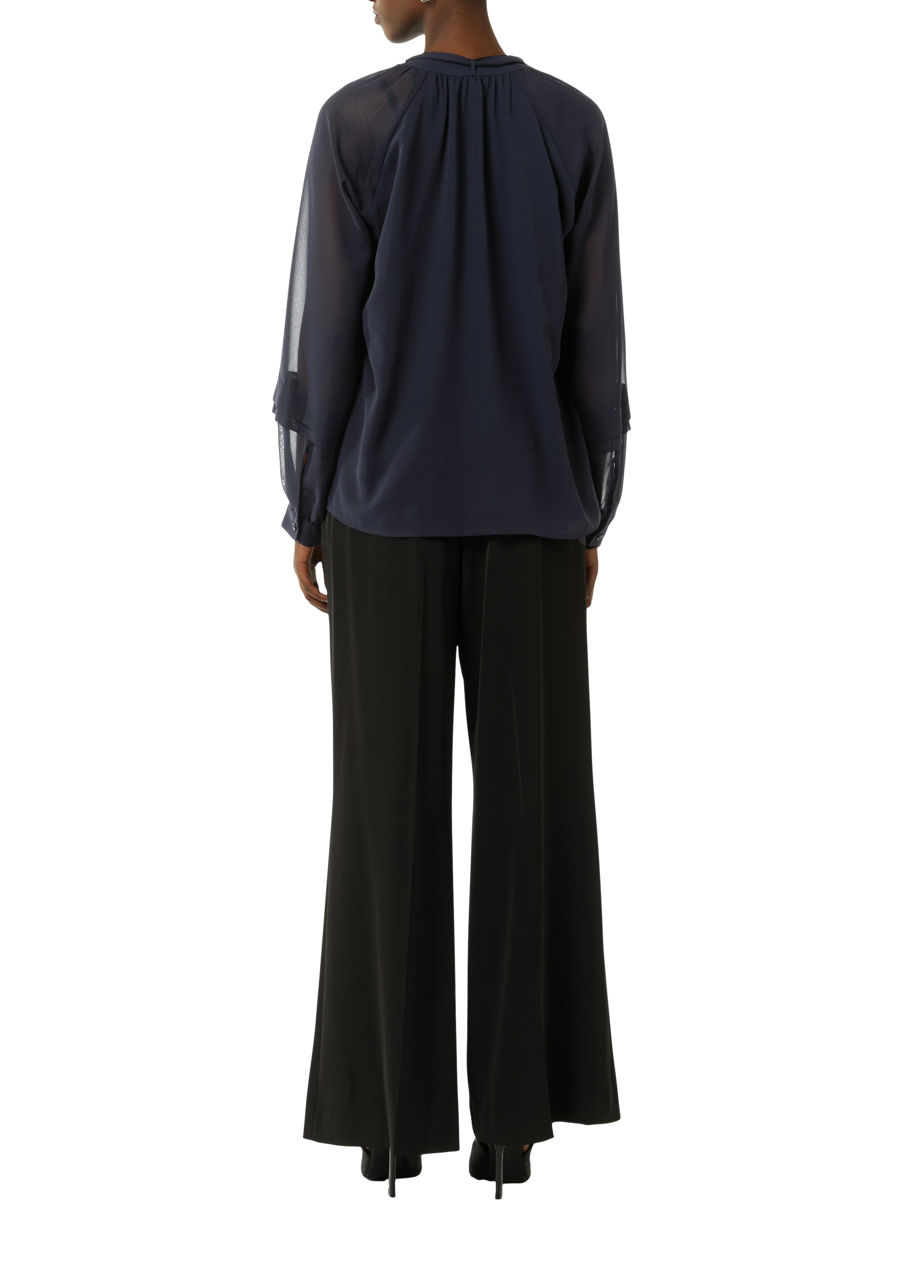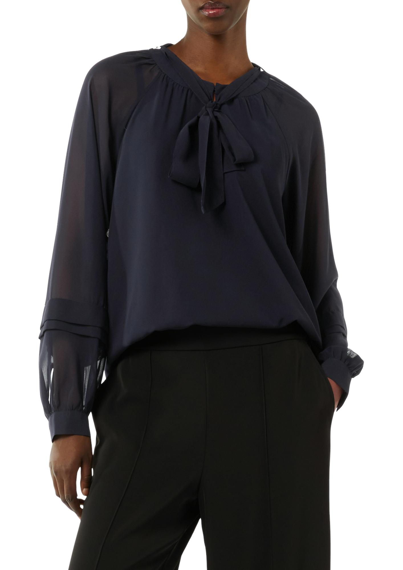 Романтичная блуза темно- синего цвета из шифона немецкого бренда Comma (Комма). Предмет сегодняшнего разговора - синяя блуза! Вещь яркая, интересная и универсальная. С чем одеть и куда носить такую одежду? Блузки синих оттенков - базовый элемент для создания многочисленных луков в деловом стиле, повседневных образах. Научившись сочетать синюю блузку с другими цветами, можно также составлять эффектные вечерние сеты. Шелковая темно - синяя блуза с черным костюмом - получается идеальное решение делового образа. Не менее стильно и сдержанно выглядит композиция с любыми оттенками серого или коричневого. Это подходящий цветовой вариант для офиса, деловой встречи, посещения зрелищных мероприятий, ужина в ресторане.
