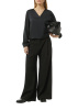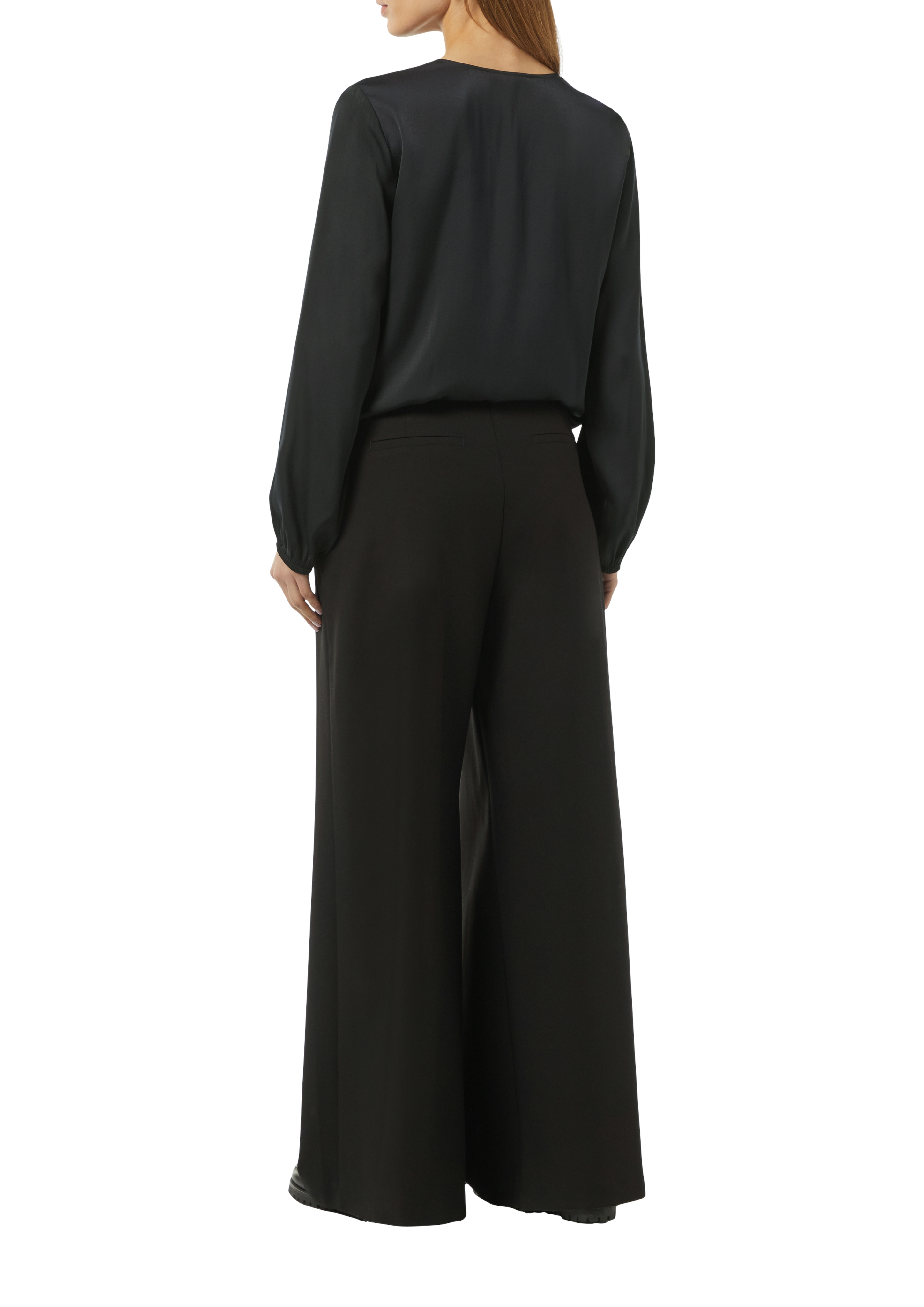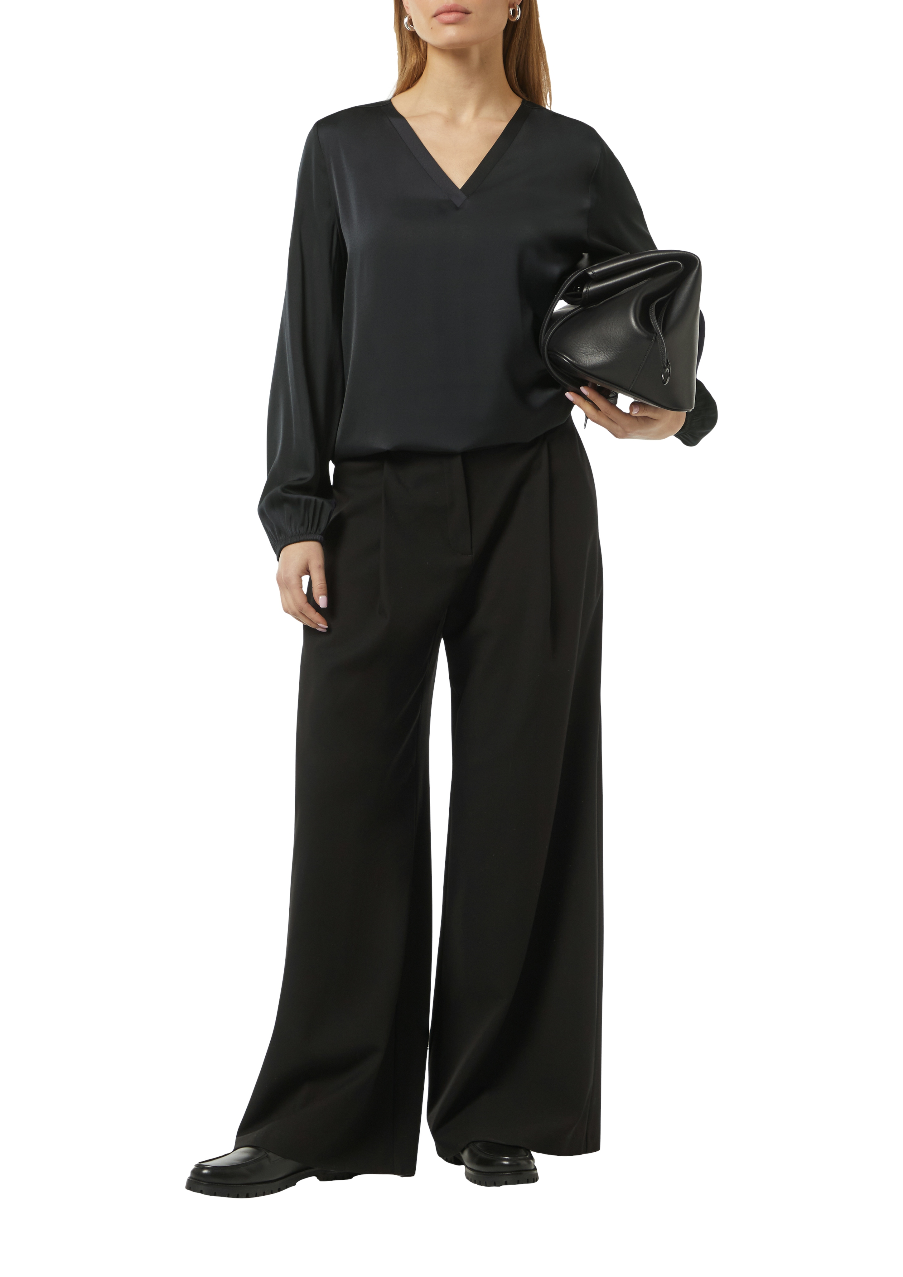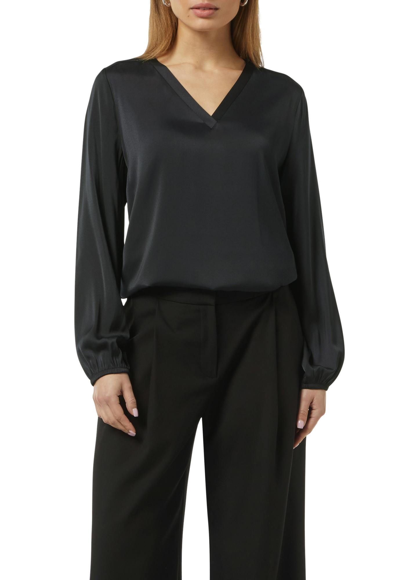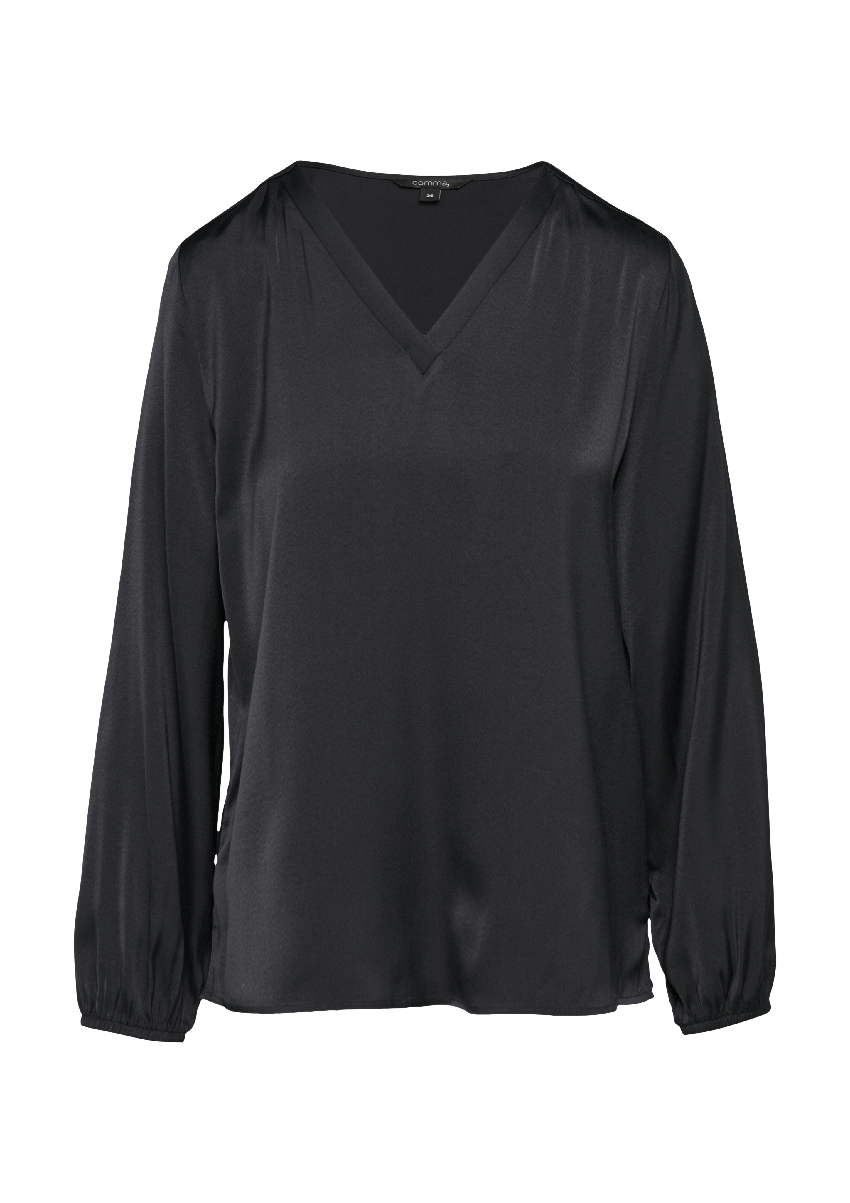 Атласная блузка с V-образным вырезом и эластичными манжетами немецкого бренда Comma (Комма). Такую блузу носят с брюками, кардиганами и пиджаками, стандартный офисный вариант, или как самостоятельный элемент гардероба с юбкой для более женственного образа