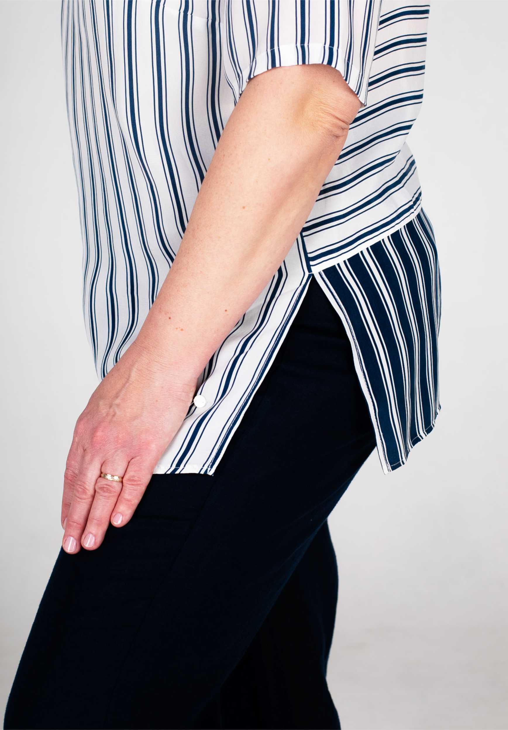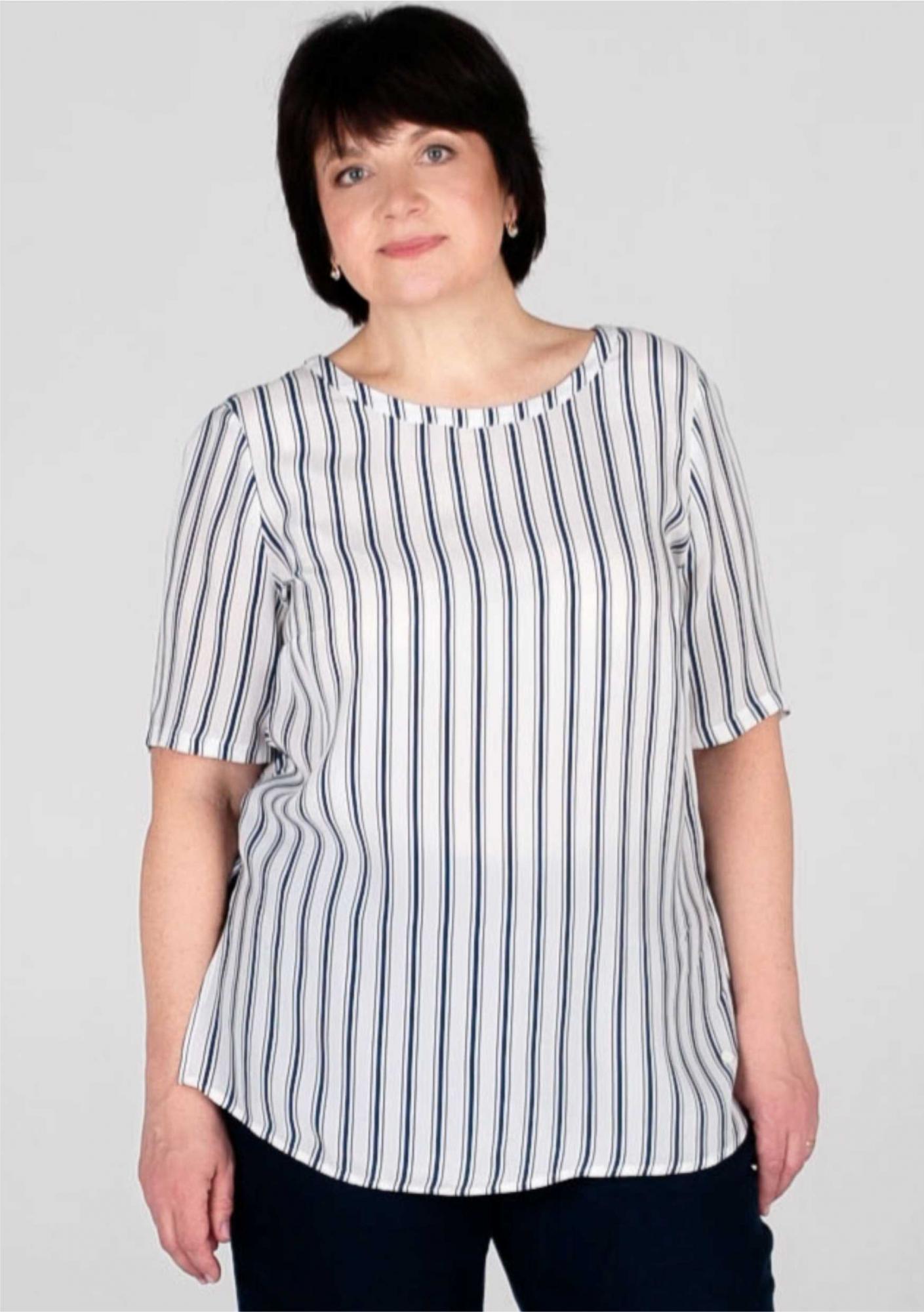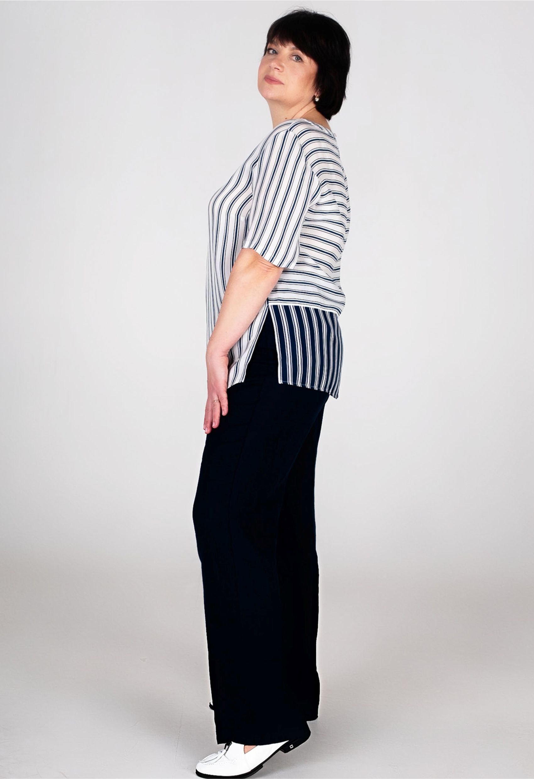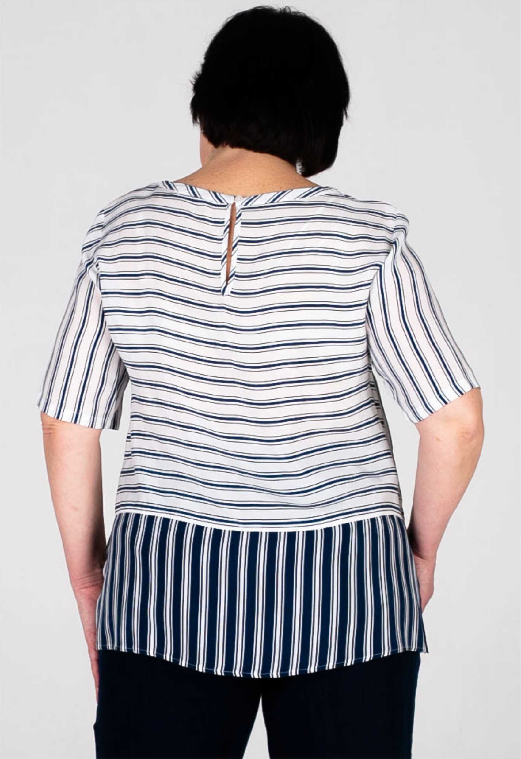 Блуза женская немецкого бренда BRAX (Бракс) в синюю вертикальную полоску спереди и комбинированную полоску сзади. Выполнена из высококачественной вискозы