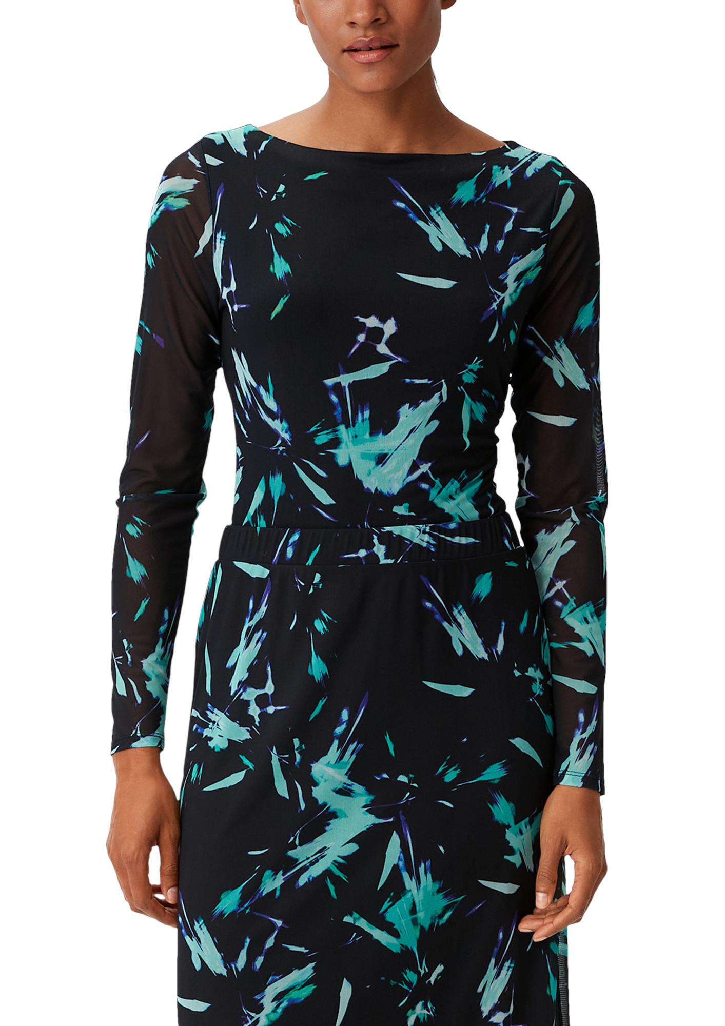Женская футболка из трикотажа-мэш немецкого бренда Comma (Комма). Приталенный женственный силуэт лонгслива с декоративными сборками на талии обеспечивает оптимальную осадку, а оригинальный принт позволяет визуально скрыть недостатки фигуры. футболка на подкладке, но не выглядит громоздко, так как верх ее выполнен из ткани мэш - сетки, премиального, необыкновенно мягкого трикотажа.. Такая модель подойдет как для романтических так и для деловых образов. Идеально впишется в гардероб любой модницы.