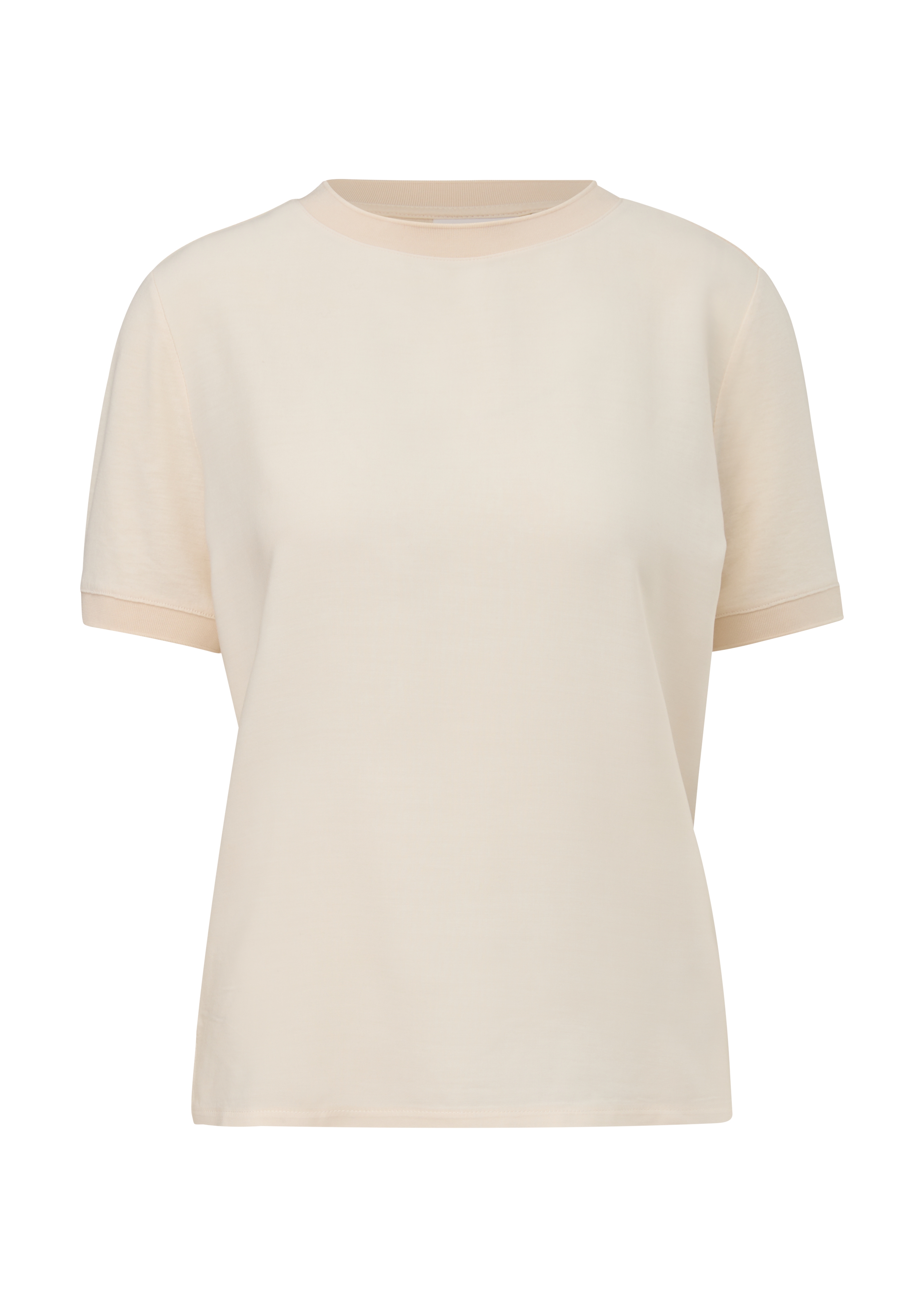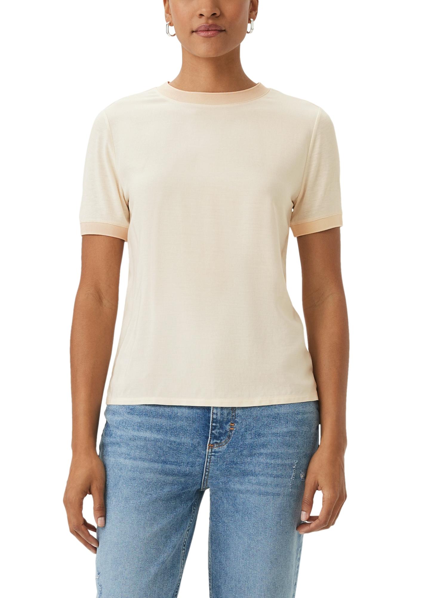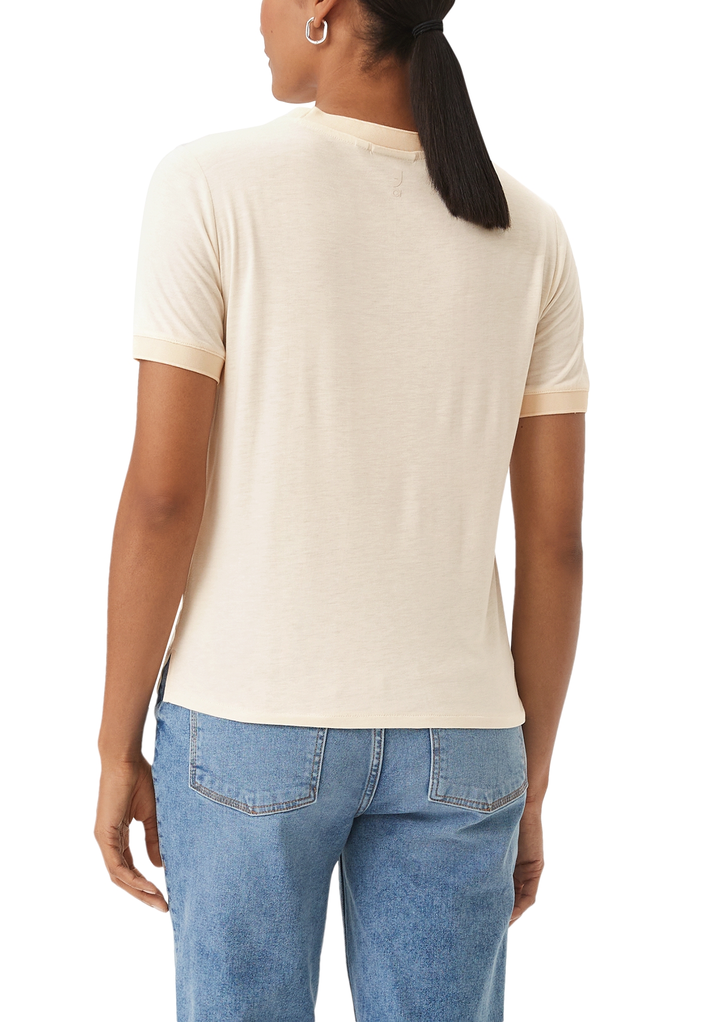 Футболка из вискозы с коротким рукавом бежевая немецкого бренда CommaCi (Комма Си). Это идеальный выбор для модного летнего наряда. Легкое вискозное волокно, приталенный силуэт, классический крой прекрасно сочетаются с пиджаками, брюками, юбками.