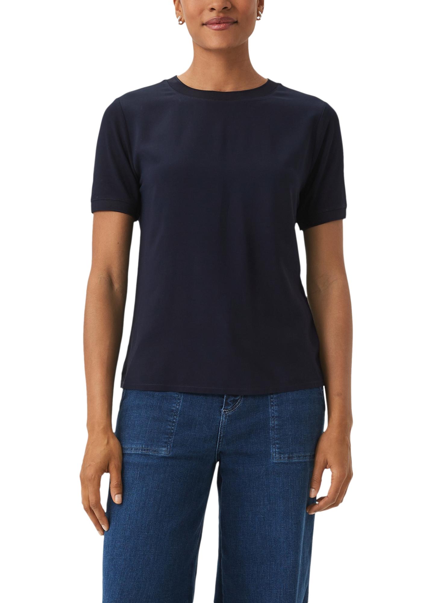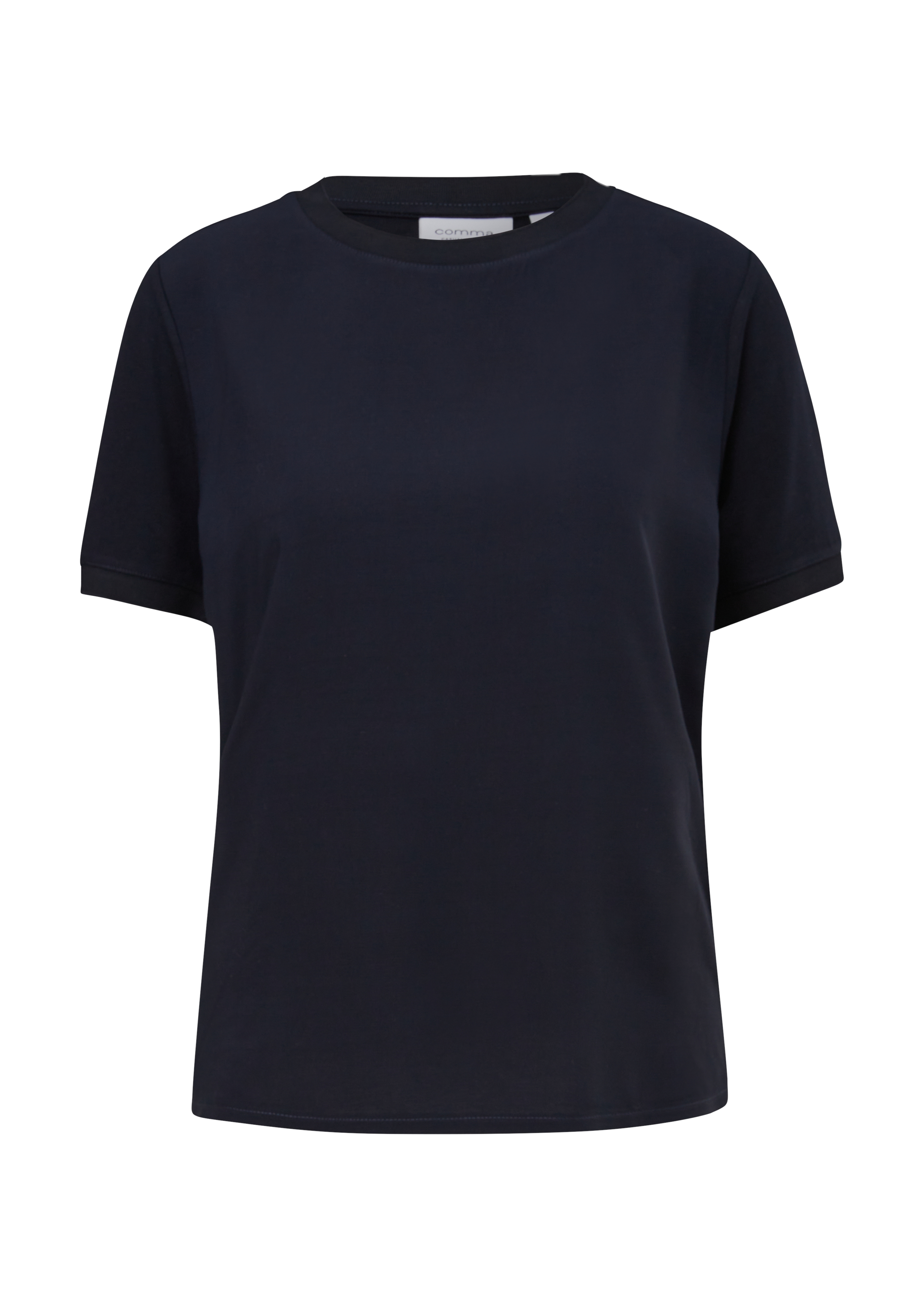 Футболка из вискозы с коротким рукавом темно-синяя немецкого бренда CommaCi (Комма Си). Это идеальный выбор для модного летнего наряда. Легкое вискозное волокно, приталенный силуэт, классический крой прекрасно сочетаются с пиджаками, брюками, юбками.