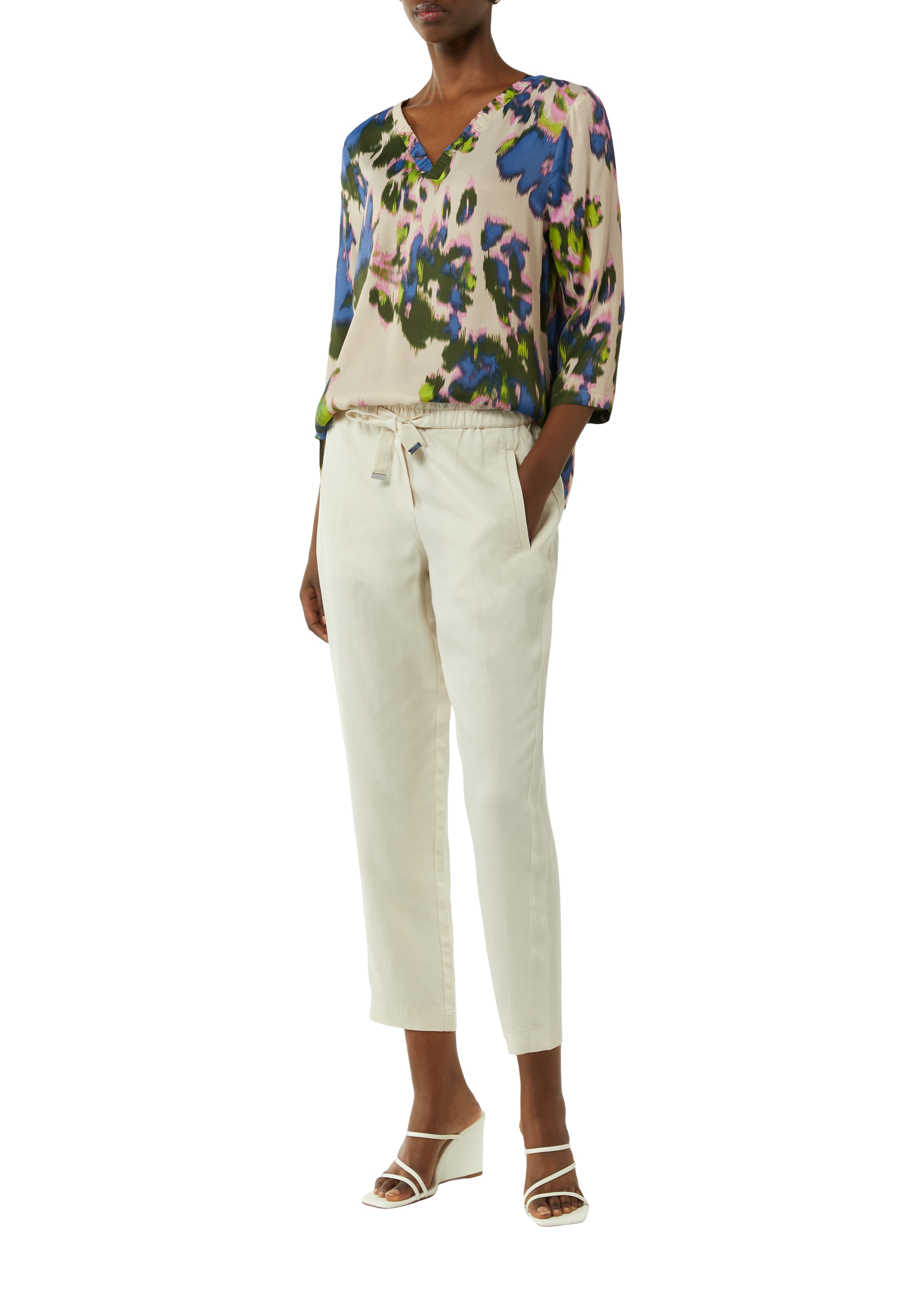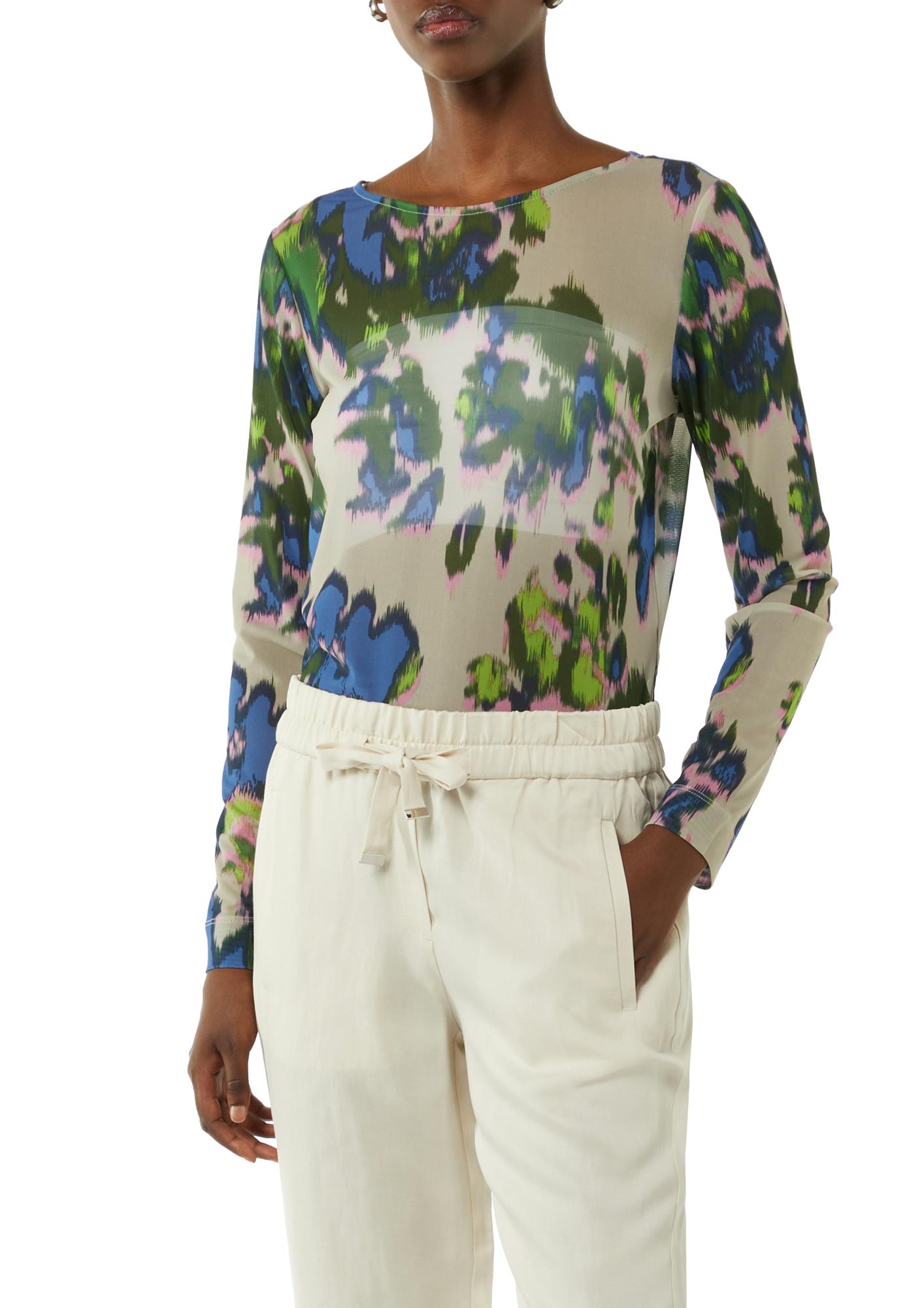 Футболка из трикотажа - мэш с цветочным орнаментом немецкого бренда Comma (Комма). Приталенный женственный силуэт лонгслива обеспечивает оптимальную посадку , а оригинальный принт позволяет визуально скрыть недостатки фигуры. Такая модель подойдет как для романтических так и для деловых образов. Идеально впишется в гардероб любой модницы.
