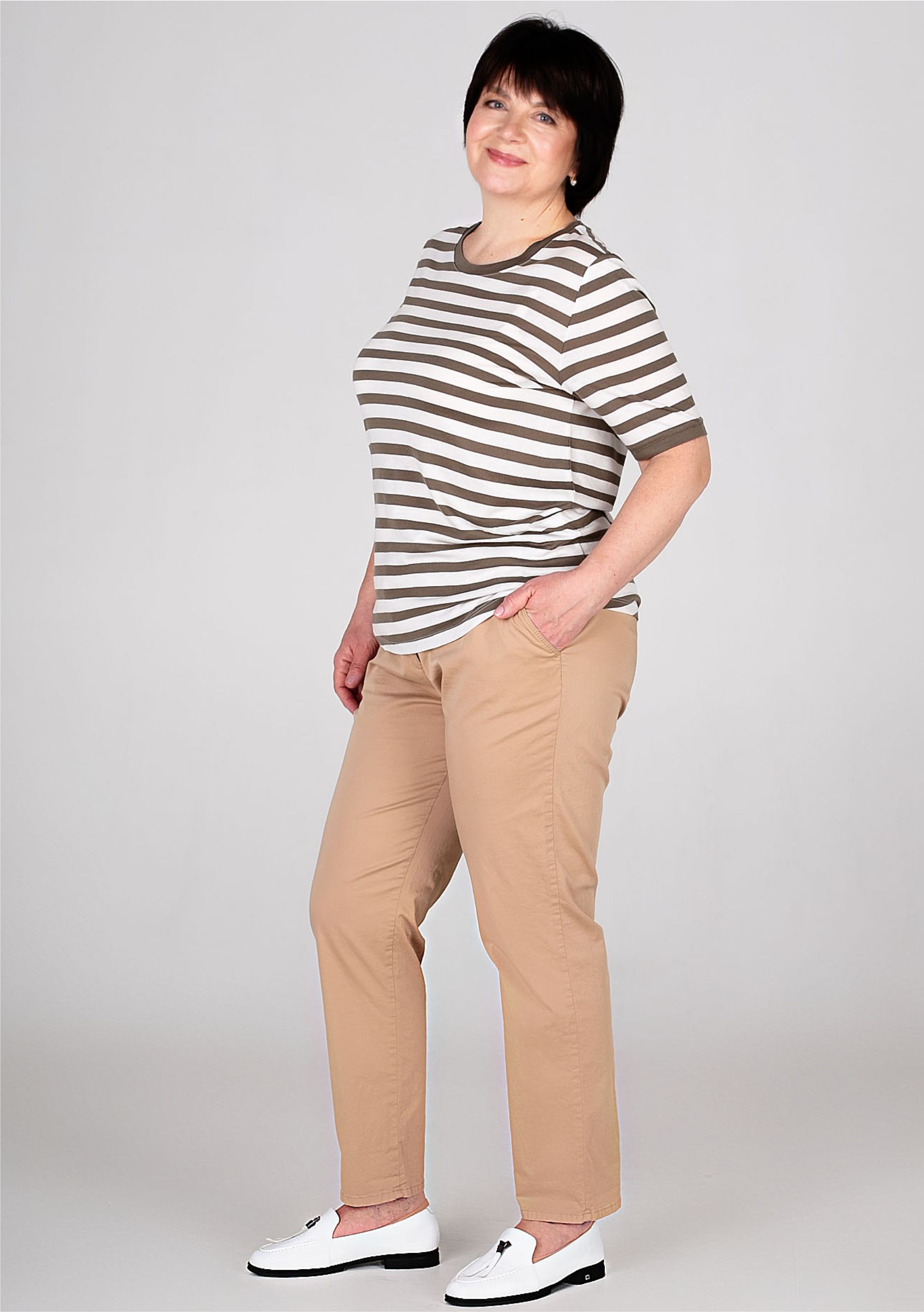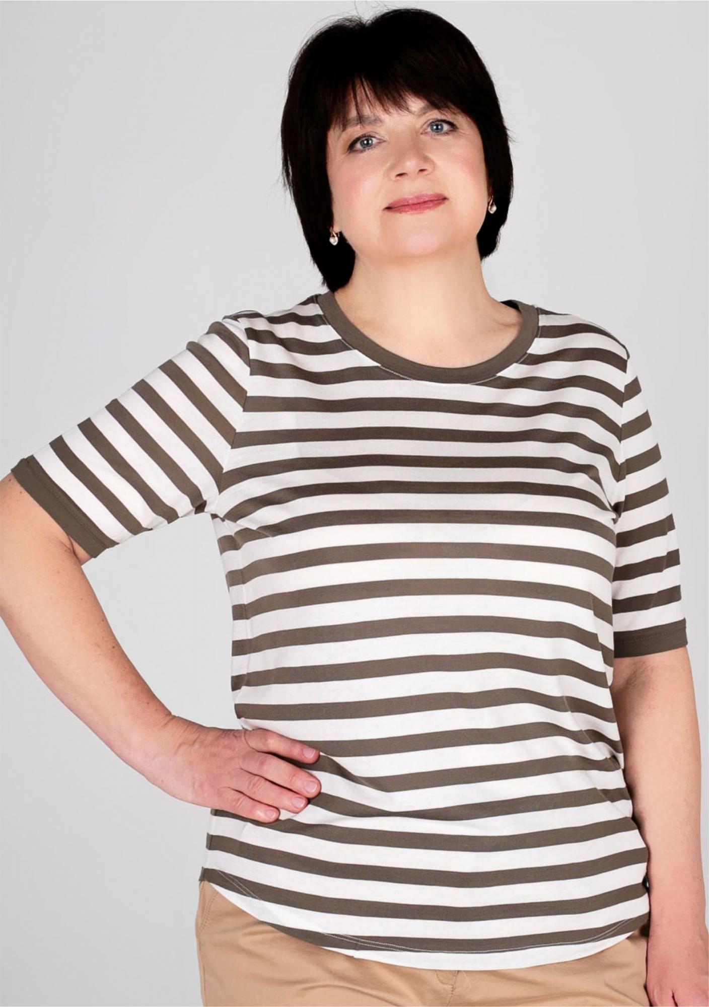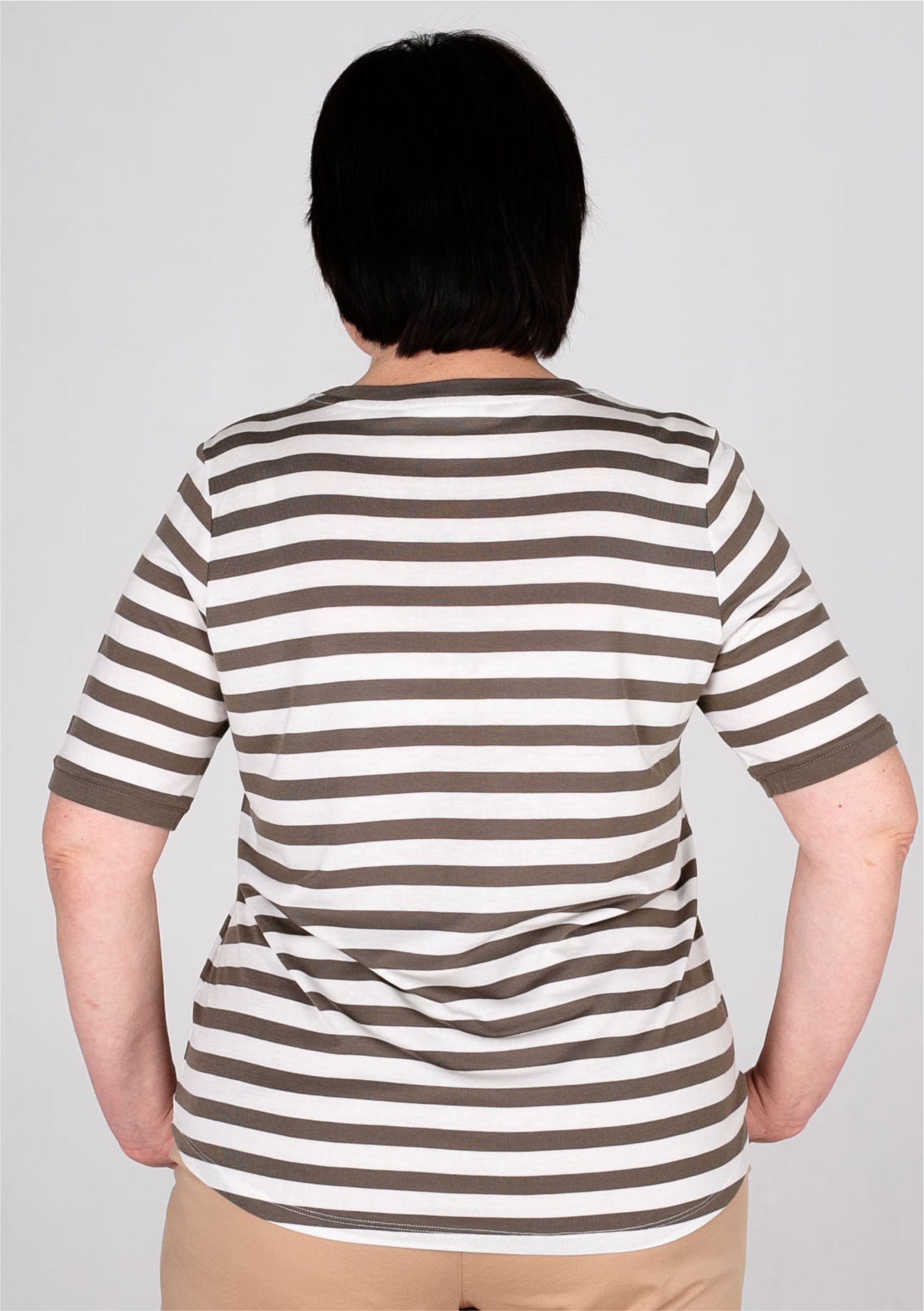 Женская футболка от немецкой фирмы BRAX (Бракс) Colette в полоску цвета хаки - это идеальный выбор для модного летнего наряда. Легкое волокно вискозы (лиоцелл), произведенное экологически безопасным способом по стандартам Blue Planet, и классическая полоска идеально сочетаются друг с другом. Контрастная отделка выреза и рукавов создает законченный образ.