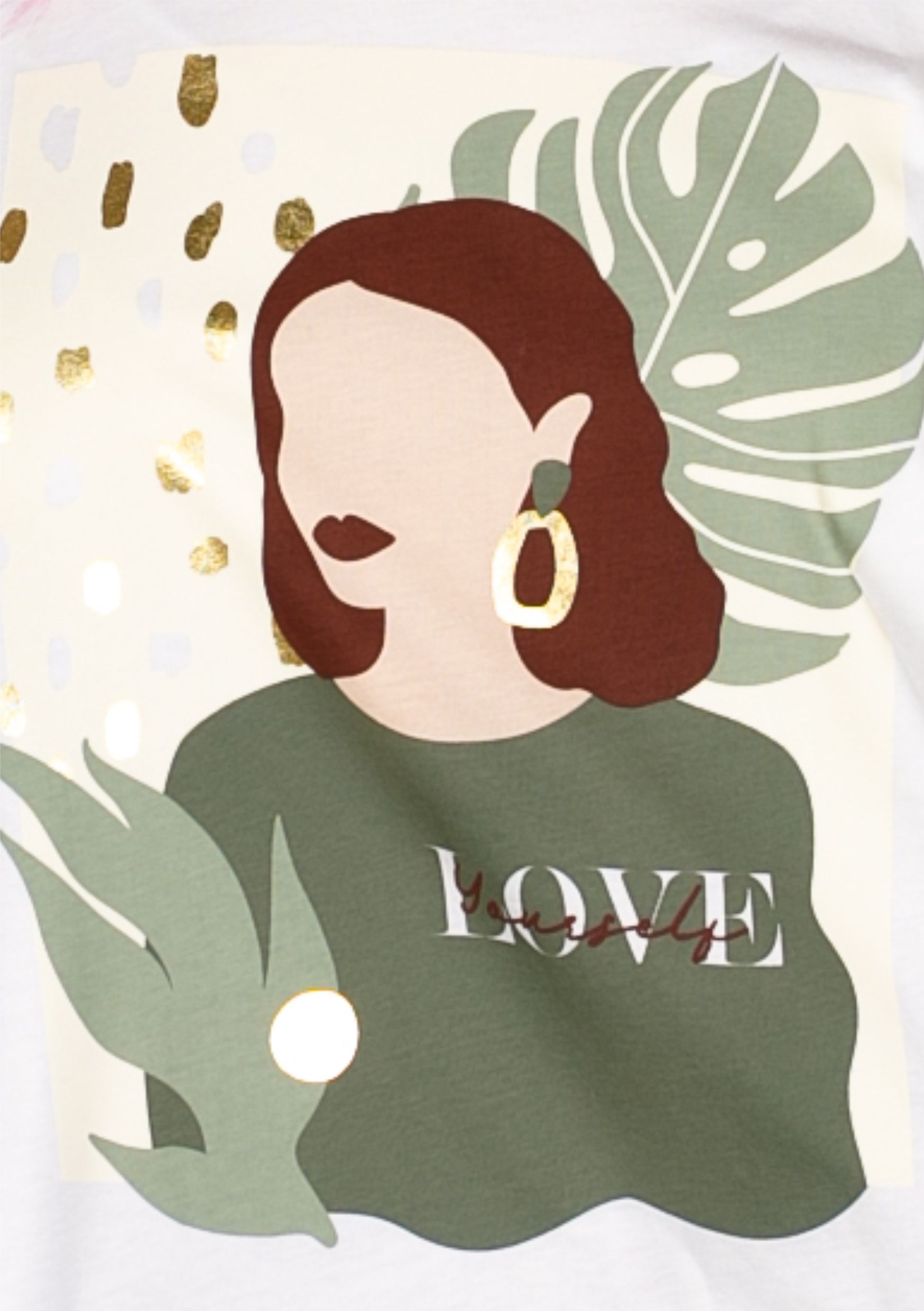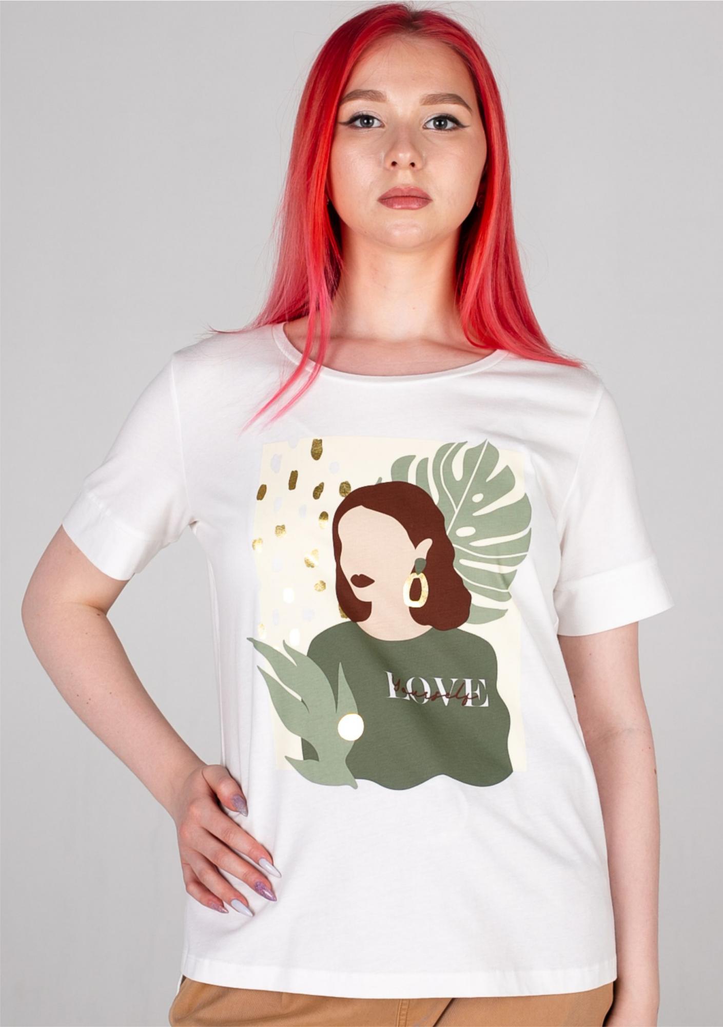 Белая хлопковая футболка от немецкого бренда Comma Ci (Комма) с принтом в виде женского портрета. Белый цвет в сочетании с тропическими мотивами создает летнее настроение.