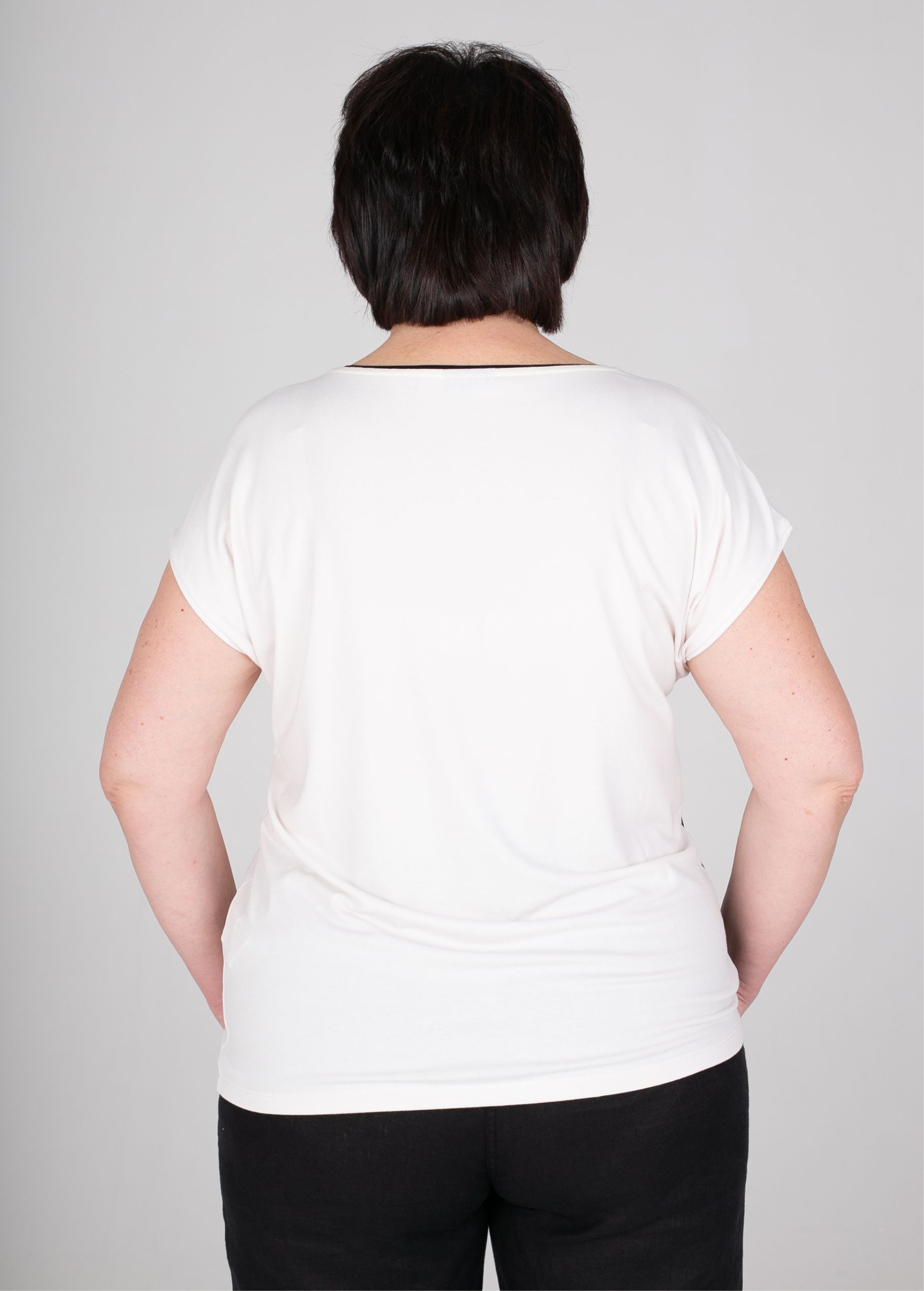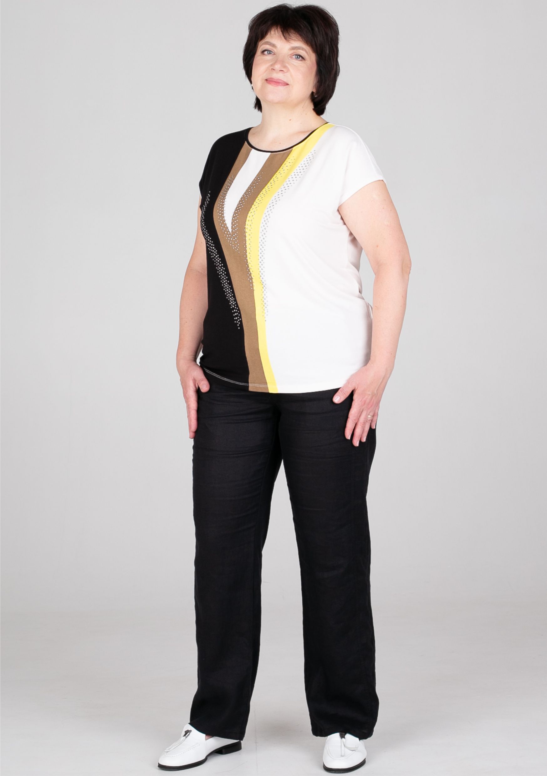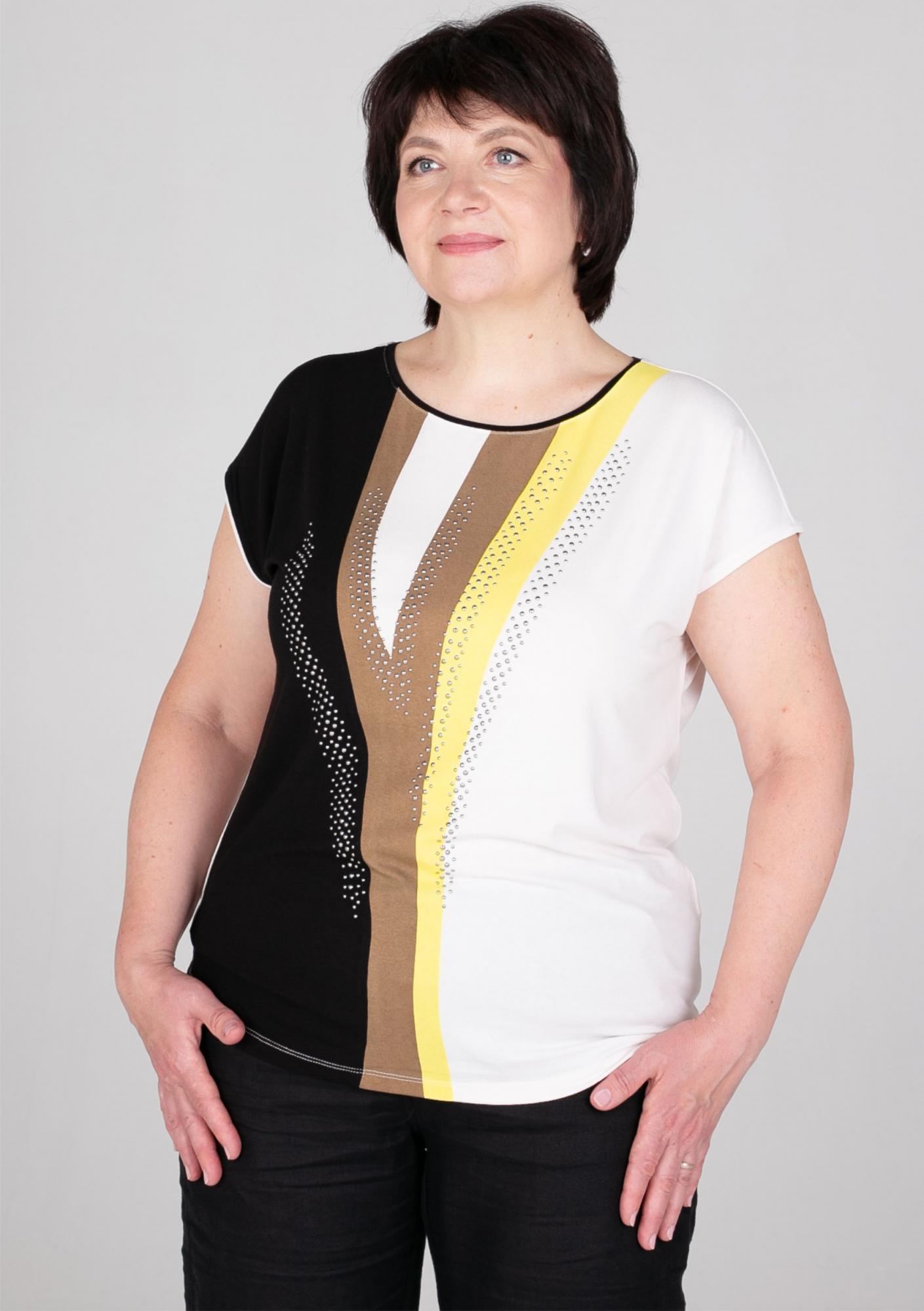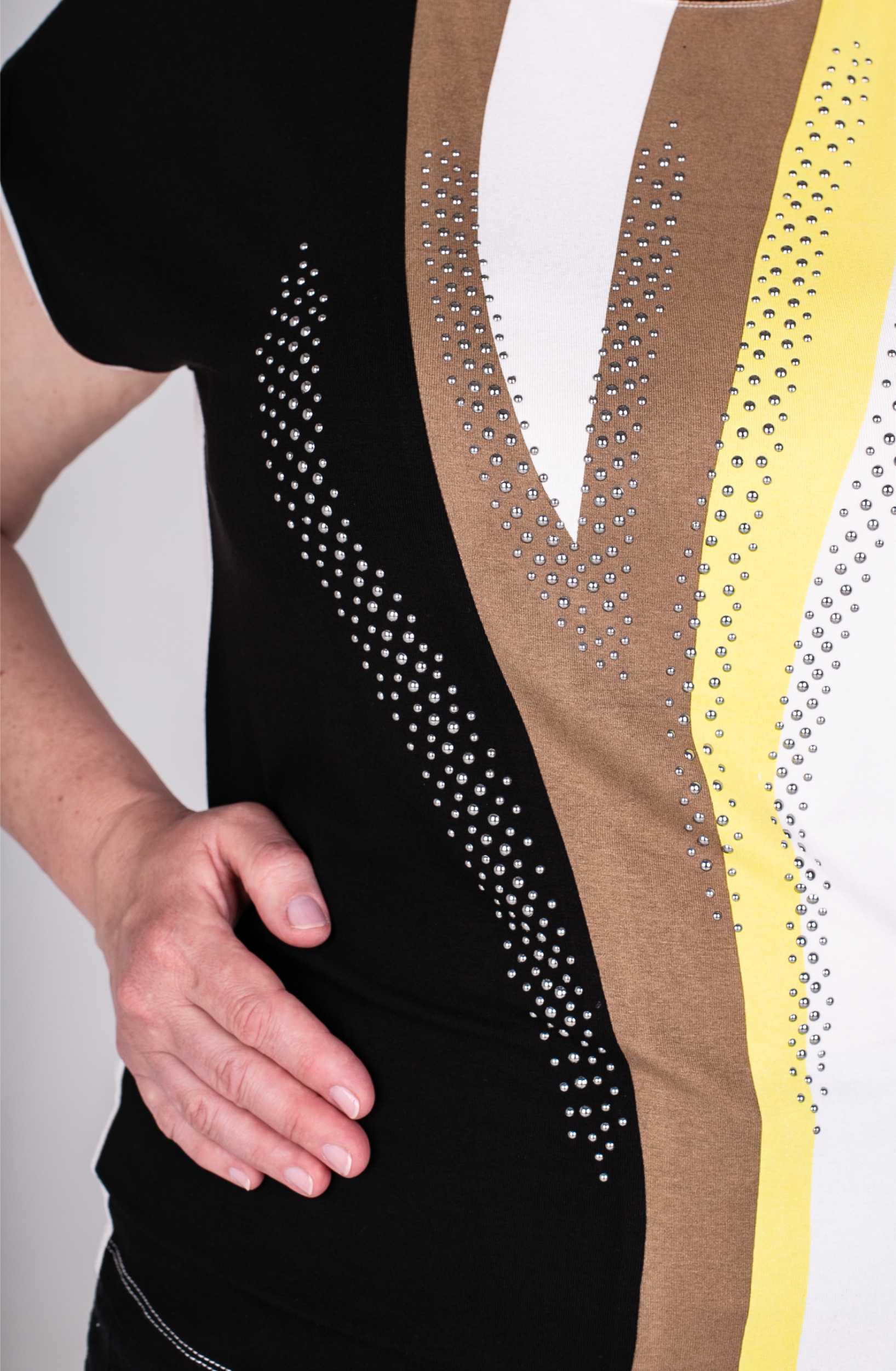 Футболка женская немецкого бренда Barbara Lebek (Барбара Лебек) с круглым вырезом и асимметричным принтом, который украшен текстильными стразами. Выполнена из вискозы с небольшим % эластана, горловина контрастного черного цвета, чуть приспущенный рукав, удобна и комфортна при носке.